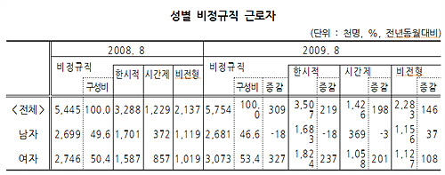 2007년 이후 비정규직 비율은 꾸준히 감소세를 보였다. 통계청의 경제활동부가조사 결과 2007년 3월 36.7%를 기록했던 비정규직 규모는 2년 넘게 꾸준히 줄어들었다. 그러던 비정규직 규모가 지난 8월 통계에서 다시 늘어났다. 9월 취업자수는 1년 전에 비해 7만1000명이 늘어났는데 비정규직 노동자 수는 무려 30만9000명이 늘어났다.
