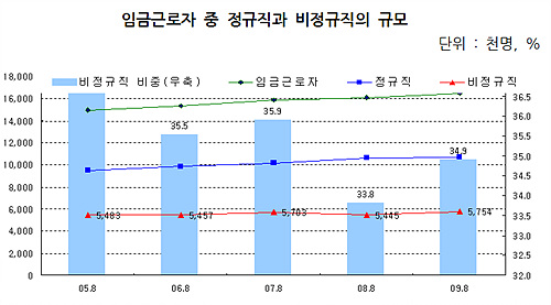 통계청이 지난 4일 내놓은 '2009년 8월 근로 형태별 및 비임금 근로 부가조사 결과'에서 주목할 것은 단연 비정규직의 증가였다. 전체 임금 노동자 가운데 비정규직의 규모는 34.9%, 575만4000명이었다.