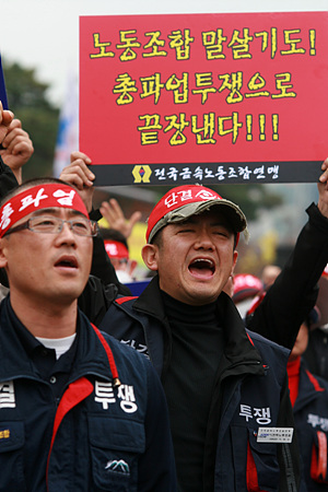 장 위원장은 "노동조합이 무너지면 지금까지 우리가 쌓아온 모든 권리와 기반도 무너져 버릴 것"이라며 "피하거나 결코 물러서지 않고 총파업 투쟁으로 돌파하자"고 호소했다. 변재환 금속연맹 위원장도 "앉아서 맞아 죽느니 서서 싸워야 한다"고 목소리를 높였다.