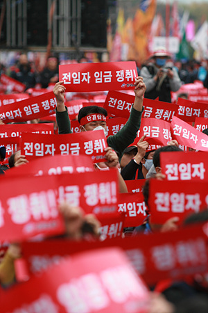| ▲ 대규모 노동자대회를 통해 협상력을 높 노동계의 첫 번째 카드 이후는 총파업 준비다. ⓒ프레시안 |