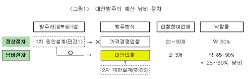 대안입찰 발주를 하면 발주기관이 총공사비의 3% 수준에서 발주한 원안 설계는 폐기된다. 경실련은 정부의 원안 설계 가격 자체가 시장가격보다 2배 이상 부풀려져 있을 뿐 아니라 대안입찰 발주를 하면 가격경쟁방식을 통해 발주하는 경우보다 30%정도 높게 공사비가 책정된다고 지적했다. 가격경쟁방식은 입찰 참여업체들의 가격경쟁력을 우선적으로 보고 낙찰을 결정하는 방식이다.