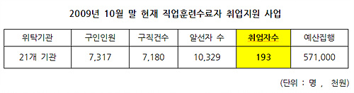 2.6%라는 저조한 취업률을 보이는 이 사업에 사용된 예산은 무려 5억7000만 원이다. 예산과 취업률만 놓고 보면, 1명을 취직시키는데 들어간 돈은 295만8549원인 셈이다.