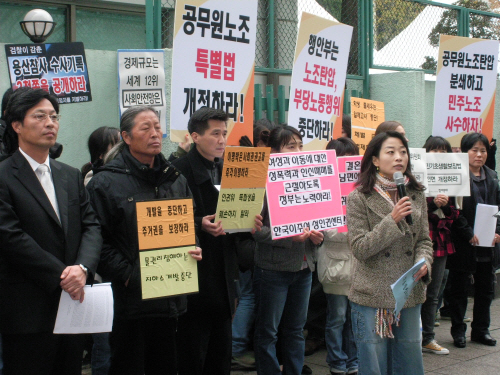 공무원 노조는 "저급 사회권 국가 망신살, 정부는 반성하라"라는 제목의 성명에서 한국을 '고성장 저사회권 국가'로 규정했다. 그리고 "공무원의 노동조합 가입 권리와 파업권에 대한 제한이 ILO(국제노동기구) 협약에 어긋난다"는 유엔 권리위 보고서 내용을 상기시켰다. 이어 공무원 노조는 노동인권에 대한 현 정부의 저열한 인식을 확인시켜 준 사례를 조목조목 열거했다. 공무원 노조 사무실 강제 폐쇄, 민중의례 참가자에 대한 중징계 요청 등이 이런 사례다.