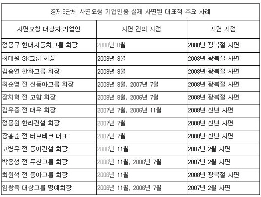 아래는 대기업 경영진들이 형사재판이 확정된 지 1년 이내에 사면받은 대표적 사례이다.(경제개혁연대 2008.10.23 발표 '경제개혁리포트 - 8.15 대기업 관련자 사면결과 분석'에서 대다수 재인용)