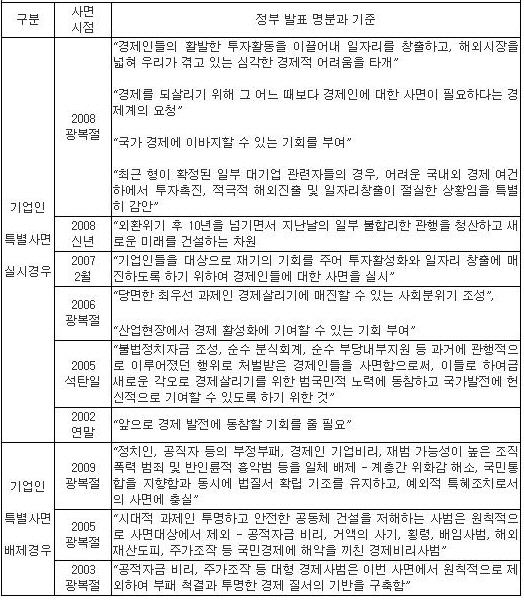 ③ 특별사면 기업인 포함 또는 배제 때 내세우는 정부의 명분