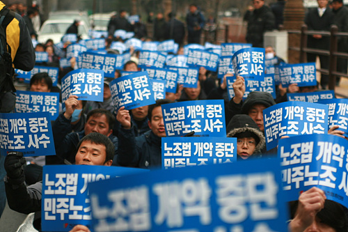 민주노총만 홀로, 1월 선출될 새 집행부와 함께 다시 '노동법 재개정' 투쟁에 들어갈 전망이다. 임성규 민주노총 위원장은 "4월 15일까지 전체 사업장이 총파업 준비를 완료하고 민주노총 지침에 따라 노동법 재개정을 위한 파업에 들어가게 될 것"이라고 공언했었다. 법은 개정됐지만 시행은 7월과 내년 7월 등 시간이 있는 만큼 '충분히 재개정이 가능하다'는 논리다.