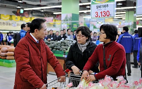 | ▲ 20일 마트에서 만난 주부들과 대화를 나누고 있는 이명박 대통령. ⓒ뉴시스 |