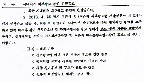 서울시는 공문에서 버스 광고 배제 기준을 △상업 광고가 아닌 모든 정당의 홍보를 위한 광고 △정치적인 구호나 정부를 비방하는 내용의 광고 △각종 선거홍보 및 후보자 홍보 광고 △전통의 미풍양속을 해치는 광고 등으로 규정하고 있다.
