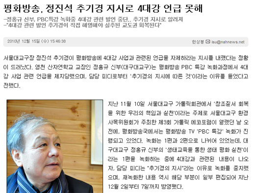 영천 산자연학교 교장인 정홍규 신부(대구대교구)는 15일 <가톨릭뉴스 지금 여기>와의 인터뷰에서 "<PBC특강> 녹화 과정에서 4대강 사업 관련 언급을 제지당했으며, 담당 PD로부터 '추기경의 지시에 따른 것'이라는 설명을 들었다"고 말했다.