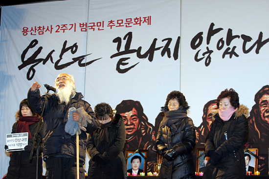 20일로 용산 참사가 일어난 지 두 해가 됐다. 용산 참사 2주기 범국민추모위원회는 서울역 광장에서 범국민추모제를 열었다. 영하 10도의 날씨에도 백기완 통일문제연구소 소장, 문정현 신부를 비롯해 이정희 민주노동당 대표, 정세균 민주당 최고위원, 조승수 진보신당 국회의원 등 500여 명이 이날 추모제에 참여했다.