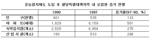 일련의 과정은 누군가를 위해 만들어진 하나의 시나리오처럼 보인다. 그러나 1998년 환경부가 수도권 시민들에게 '물이용부담금'을 도입할 당시 화제가 됐던 난개발의 문제를 잊어선 안 된다. 당시의 상황은 처참했다. 아파트는 500% 이상 증가했고, 숙박시설과 산업시설은 최대 300% 가까이 증가했다.