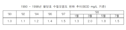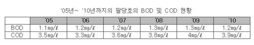 팔당의 현실은 BOD는 답보, COD는 증가추세다. 수질개선을 위해서는 BOD 이외의 다른 수질 지표 저감 정책이 추진되어야 한다는 뜻이다. 팔당호의 COD의 증가 추세는 심각하다. 2005년부터 2010년까지의 COD는 전반적으로 계속 증가하고 있다. COD 수치가 높다는 것은 독성화학물질, 중금속 등 미생물로 분해할 수 없는 난분해성 물질이 그만큼 증가했다는 것을 의미한다.