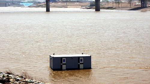 | ▲ 가물막이가 붕괴되면서 공사장 인부들이 사용하던 컨테이너 화장실이 강가로 떠내려왔다. ⓒ녹색연합 |