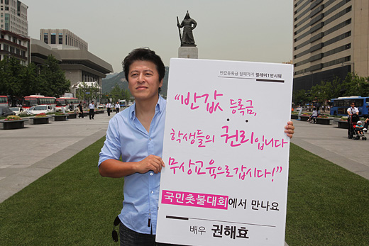 7일 정오, 서울 광화문 광장에서 만난 배우 권해효 씨는 기자의 질문에 이렇게 답했다. 반값 등록금 실현을 위한 1인 시위 도중이었다. 그는 "기성세대는 그간 대학생들을 두고 사회에 관심을 가지지 않고 각자 논다고 손가락질만 했다"며 "하지만 이들을 이런 세상에 살게 한 건 우리 기성세대의 책임"이라고 설명했다.