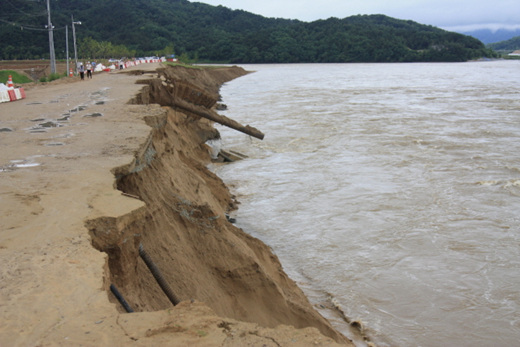 22일 민주당 김진애 의원과 '4대강 현장 시민공동조사단'은 지난 18~20일 낙동강과 금강의 장마·홍수 피해 현황을 조사한 결과, 예년과 비슷한 수준의 장마에도 지천 곳곳에서 제방과 하상유지공이 유실되는 등 피해가 발생했다고 밝혔다.