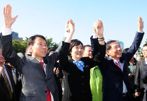 | ▲ 3일 오후 서울 장충체육관에서 열린 서울시장 야권단일후보 국민참여경선을 앞두고 (왼쪽부터)최규엽 민노당 후보, 박영선 민주당 후보, 박원순 시민사회 후보가 손을 잡고 시민들에게 인사를 하고 있다. ⓒ뉴시스 |