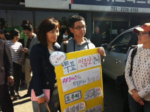 | ▲ 3일 장충체육관을 찾은 공지영 작가가 시민들과 함께 '투표 인증샷'을 찍고 있다. ⓒ트위터 |