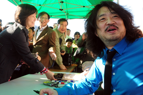 각 후보 못지않게 인기를 끈 부스도 있었다. 최근 <나는 꼼수다> 방송을 통해 인기몰이를 하고 있는 김어준 <딴지일보> 총수는 오후 3시께 팬 사인회를 시작해 발 디딜 틈 없는 인기를 과시했다. 특히 사인을 요청한 한 시민은 김 총수가 "뭐라고 써드릴까요"라고 묻자 "존나씨파라고 써주세요"라고 말해 폭소가 터지기도 했다.