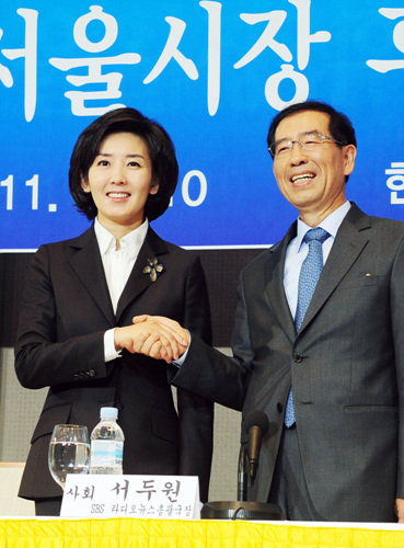 | ▲ 10일 열린 관훈토론회에서 한나라당 나경원 후보(왼쪽)과 범야권의 무소속 박원순 후보가 악수하고 있다. ⓒ뉴시스 |