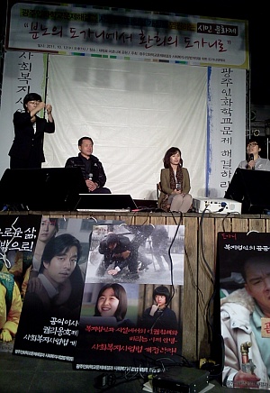 12일 서울 대학로 마로니에 공원에서는 '광주 인화학교 사건해결과 사회복지사업법 개정을 위한 도가니대책위원회' 주최로 영화 <도가니> 원작자 공지영 소설가, 여균동 영화감독, 김영목 목사(인화학교 성폭력대책위 대표), 인화학교 졸업생 등이 이야기 손님으로 참석하는 문화제가 열렸다.