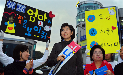 선거를 이틀 앞둔 24일 오후 서울 서초구 방배동. 나경원 한나라당 후보의 거리 유세가 시작되자, 지지자들의 연호 속에 지나가던 주민들도 하나 둘 발걸음을 멈췄다. 마이크를 잡은 나 후보는 "강남과 서초가 발전한 것처럼" 서울시를 이끌겠다고 목소리를 높였다. 주민 일부가 고개를 끄덕였고, 일부는 잠시 멈춰 섰지만 곧 발걸음을 재촉했다.