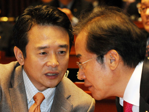 | ▲ 남경필 국회 외교통상통일위원장(왼쪽)과 한나라당 홍준표 대표가 28일 한미FTA 비준안 처리 논의를 위해 소집된 의원총회에서 귀엣말을 나누고 있다. ⓒ뉴시스 |