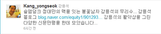 강 의원은 24일 자신의 트위터(@Kang_yongseok)에 "슬램덩크 정대만의 맥을 잇는 불꽃남자 강용석의 무리수…강용석의 활약상을 그린 다양한 신문 만평을 한데 모았습니다"라며 자신의 블로그 주소를 링크했다. (☞블로그 바로 가기)