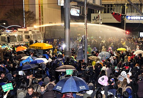 | ▲ FTA 비준안 처리 반대 촛불집회 후 시민과 대치한 경찰이 물포를 쏘고 있다. ⓒ뉴시스 |