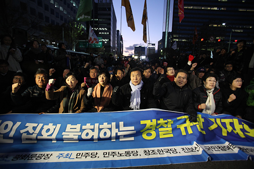 경찰은 한미FTA 비준 무효 집회를 막기에 급급한 모양새다. 경찰은 3일 한미FTA저지 범국민운동본부 주최의 집회를 불법으로 규정하고 집회 장소인 광화문광장을 원천 봉쇄했다. 세종로와 태평로 일대에 차벽을 설치하고 시위대의 광장 진입을 차단했다. 또한, 경력 114개 중대 8000여 명을 투입했다.
