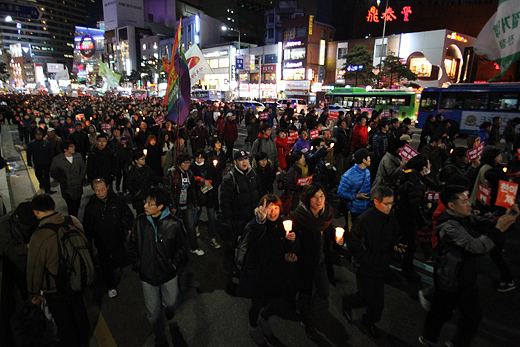 이 소식을 트위터 등을 통해 접한 시민이 종각 쪽으로 몰려들면서 시위대 규모는 더욱 커졌다. 그러자 연좌농성을 벌이던 시위대는 6시 20분께 남대문과 서울광장 등을 거쳐 청계광장으로 가두행진을 진행했다. 이후, 저녁 8시께 청계광장 뒤편인 예금보험공사 앞에서 집회를 시작했다.
