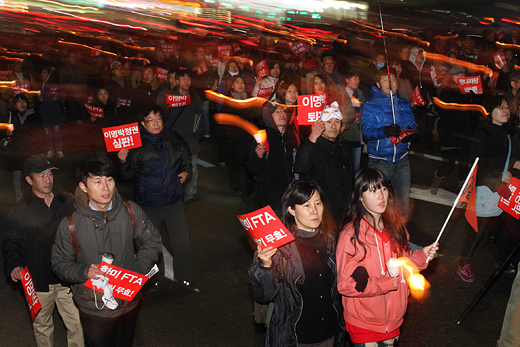 이들은 '명박 퇴진, 비준 반대'를 외치며 종로에서 을지로, 남대문, 시청광장을 지나 청계천 인근 영풍문고까지 가두행진을 벌였다. 경찰은 종각 보신각 앞에서 이들의 행진을 막았고, 시위대는 종각 앞 편도 6차선에서 연좌농성을 벌였다.