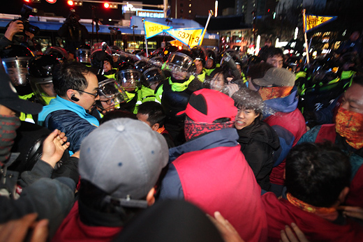 | ▲ 경찰과 대치하고 있는 시위대. 경찰이 최루액을 쏘고 있다. ⓒ프레시안(최형락) |