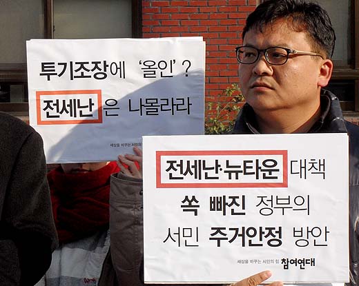 | "또다시 망국적 부동산 투기를 조장하고 있다" 8일 참여연대, 토지정의시민연대 등은 서울 종로구 청운동사무소 앞에서 기자회견을 열고 "12.7 부동산대책을 철회하고 서민 주거안정대책을 마련해야 한다"고 촉구했다. 이들은 "현재 우리 사회는 극심한 전세난으로 유목민처럼 떠도는 '전세유민'이 그 수를 헤아릴 수 없다"며 "그럼에도 정부는 이에 대한 실효성 있는 대책을 마련하기는커녕 집 부자들을 부추겨 또다시 망국적 부동산 투기를 조장하고 있다"고 비판했다. 그간 시민단체에서는 전세난 완화를 위해 중장기적으로 임대주택 공급을 확대하고 단기적으로는 임차인들에게 1회에 한해 계약갱신청구권을 부여, 임대료 인상률 상한제를 도입하는 주택임대차보호법 개정 등을 촉구해 왔다. |