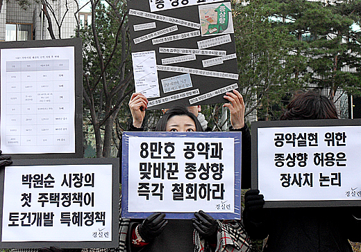 | ▲ 경실련은 13일 서울시청 앞에서 기자회견을 열고 지난 8일 발표한 가락 시영 재건축 단지의 종 상향 허용을 비판했다. ⓒ프레시안(허환주) |