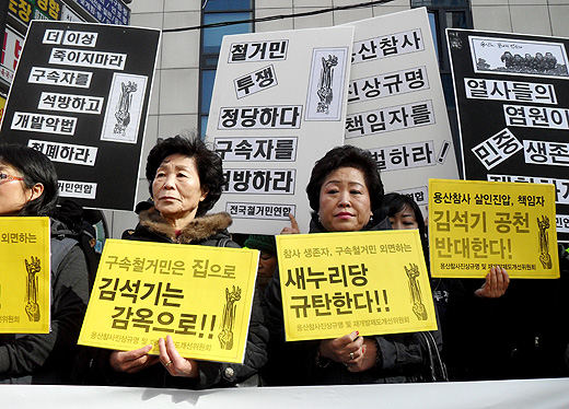 이강실 용산참사 진상규명위원회 공동대표는 "김석기를 새누리당 의원으로 공천하는 건 새누리당 쇄신과도 반대되는 결정"이라며 "쇄신을 외치면서 정작 하는 짓은 구태를 답습하고 있다"고 비판했다.