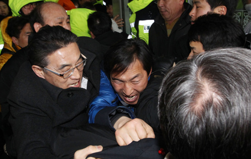 ▲ 선거구 통폐합 지역으로 거론되는 경남 남해, 하동 주민들이 17일 의원회관에서 새누리당 주성영, 민주통합당 박기춘 간사 등의 면담을 요구하다 경위들에 의해 끌려나오고 있다. ⓒ연합뉴스