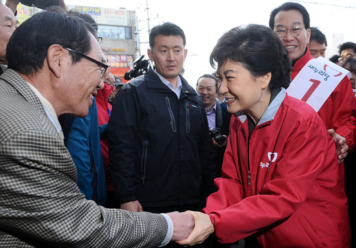 | ▲ 29일 종로구-중구 합동 유세 현장을 찾은 박근혜 위원장이 지지자들을 향해 손을 흔들고 있다. ⓒ뉴시스 |