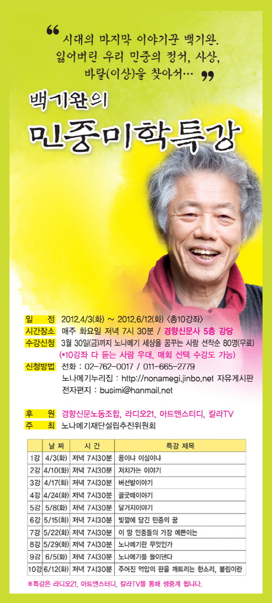 백 소장은 "때로는 한 사람의 배알튀로 드러나기도 하고 또 때로는 일체의 어두움을 사르는 변혁의 불길로 또 때로는 바랄의 실체인 희망으로 지화자 빛나기도 했다"며 "그 정서와 사상이 역사고 전통이고 실천이다. 그것을 살려 오늘에 들이대자는 것이 이참의 특강이다"고 말했다.