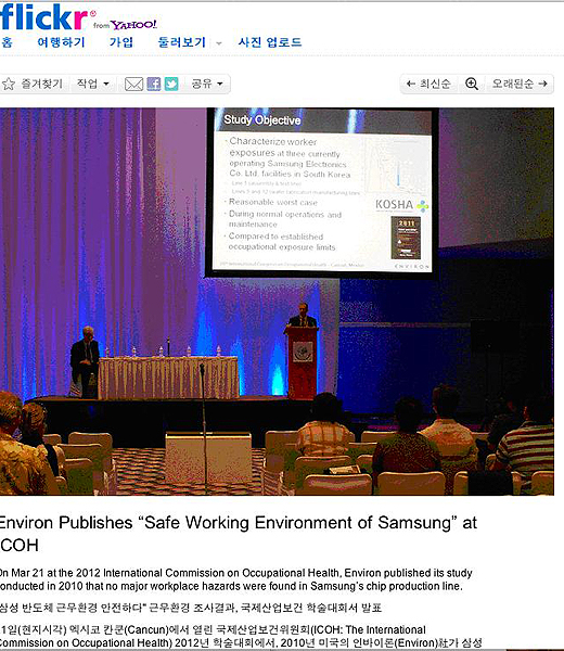 최 소장은 "발표 직후 삼성 측은 인터넷에 인바이런 발표사진을 올리며 <ICHO Verifies "Samsung's Safe Working Environment">라고 영문설명을 달았다"며 "영문설명을 직역하면 '국제산업보건위원회가 '삼성의 안전한 작업환경'이 사실임을 증명했다'는 것으로, 학술대회에서의 단순 발표내용을 마치 ICOH가 인정했다(verify)는 식으로 표현했다"고 밝혔다.