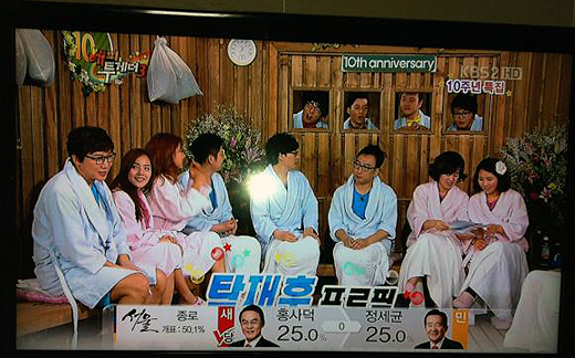KBS는 예능프로 <해피투게더> 재방송에서 접전 지역인 서울 종로구 투표율 자막 방송을 내보냈다. 이 과정에서 홍사덕 새누리당 후보가 당선됐다는 당선 체크를 내보내 문제가 되고 있다.