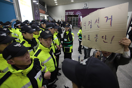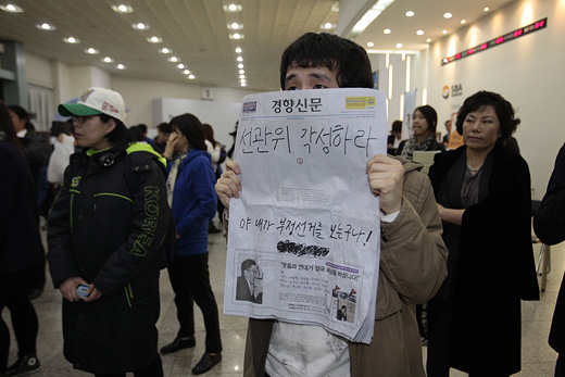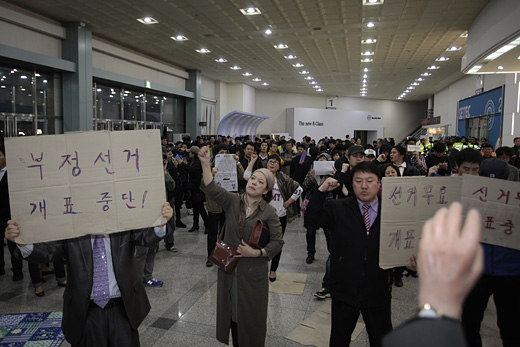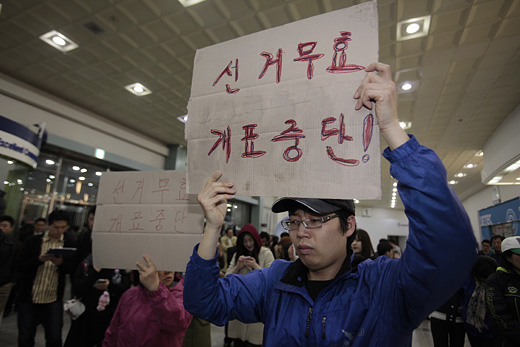 민주통합당은 11일 "문제 있는 투표함의 사용과 관련해 선관위의 전체 상황에 대한 공식 사과를 요구한다"면서 "강남갑구를 포함 강남구 지역 전체의 개표를 전면 중단하라"고 촉구했다. 현재 강남을 개표소 앞에도 시민들이 몰려 개표 중단을 요구하며 항의하고 있다.
