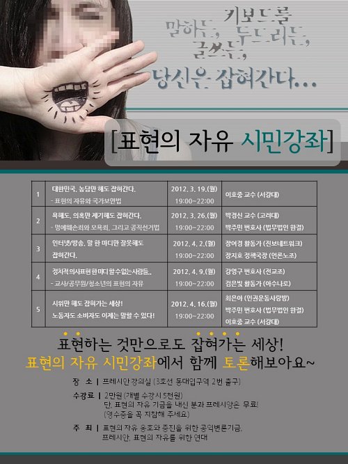 총선과 대선이 있는 2012년은 많은 것을 변화시킬 수 있는 기회입니다. 그런데 이번 총선에서 '표현의 자유'에 대해 얘기하는 정치인들을 본 적이 있나요? 안타깝게도 '표현의 자유'에 대한 불만, 갈망이 전과 같지 않아 보입니다. 예전과 크게 달라진 건 없는 것 같은데 말이죠. 이에 '표현의 자유 옹호와 증진을 위한 공익변론기금', '표현의 자유를 위한 연대회의'와 프레시안이 표현의 자유에 대한 시민강좌를 주최합니다. 3월 19일부터 4회에 걸쳐 국가보안법, 명예훼손-모욕죄, 공직선거법, 인터넷-방송 표현의 자유, 교시-공무원 및 청소년의 표현의 자유에 대해 알아봤습니다.