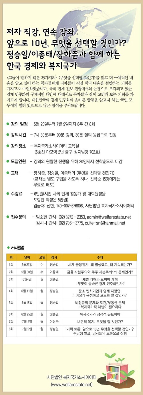 강연은 오는 23일 첫 시작으로 8주 간 8회에 걸쳐 진행되며 장소는 서울 마포역 인근의 복지국가소사이어티 교육실에서 열린다. 관련 접수 문의는 02-3272-2353