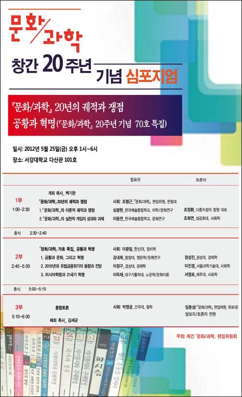 25일 심포지엄에서는 강내희 중앙대 교수, 심광현 한국예술종합학교(한예종) 교수, 이동연 한예종 교수, 이정구 경상대 연구교수, 이득재 대구가톨릭대 교수가 발표자로 나선다. 이 중 강내희 교수와 심광현 교수는 <문화/과학> 창간 멤버다. 토론자로는 이진경 서울과학기술대 교수, 조정환 '다중지성의 정원' 대표, 정성진 경상대학교 교수, 조희연 성공회대 교수, 서영표 제주대 교수가 참여한다.
