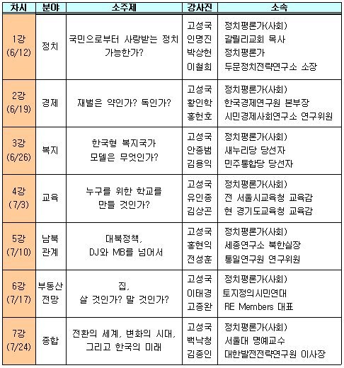2~7강 출연진도 화려합니다. 각 분야별로 경제(황인학-홍헌호), 복지(안종범-김용익), 교육(유인종-김상곤), 남북관계(홍현익-전성훈), 부동산(이태경-고종완) 분야에서 국내 최고 전문가들이 나서 열띤 토론을 벌입니다. 특히 마지막 종합 강연에서는 백낙청 선생과 김종인 박사가 한 자리에서 한국 사회의 진로를 모색하는 시간을 갖습니다.