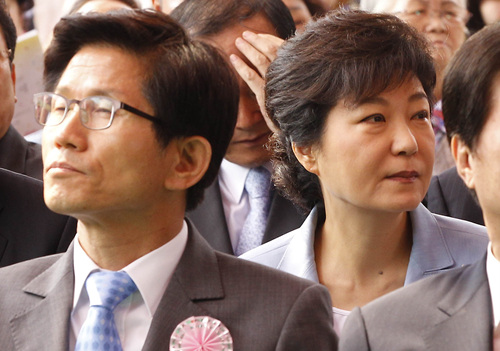 ▲ 석가탄신일인 지난달 28일 조계사 행사에 참석해 다른 곳을 바라보고 있는 김문수 경기지사(왼쪽)과 박근혜 전 비상대책위원장. ⓒ연합뉴스