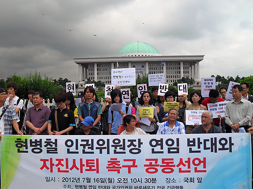 현병철 연임반대와 자진사퇴 촉구 공동선언 참가자 일동은 16일 오전 서울 여의도 국회의사당 앞에서 기자회견을 열고 "국회는 국회의 권한으로 현병철 연임을 막아야 한다"며 전국 40여개 인권시민사회단체들과 개인 1600여 명에게 받은 자진사퇴 촉구 선언문을 발표했다.