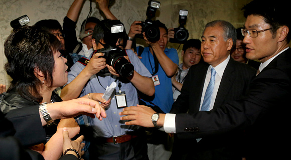 | ▲ 청문회 정회 시간. 현병철 후보자가 청문회장을 나가는 과정에서 용산참사 유가족이 강하게 항의하고 있다. ⓒ연합뉴스 |