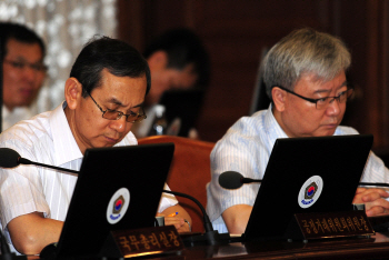 | ▲ CD 금리 조작 의혹 조사를 둘러싸고 대립하고 있는 김동수 공정거래위원장(왼쪽)과 김석동 금융위원장. ⓒ뉴시스 |
