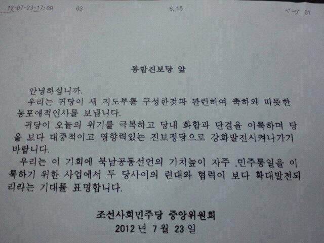 | ▲ 조선사회민주당이 통합진보당에 발송한 축전. 정작 이 축전은 주소지를 잘못 찾아 통합진보당이 아닌 진보신당에 발송됐다. ⓒ프레시안 |